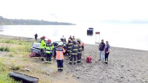 Camión pierde el control, choca auto mal estacionado y termina en el lago